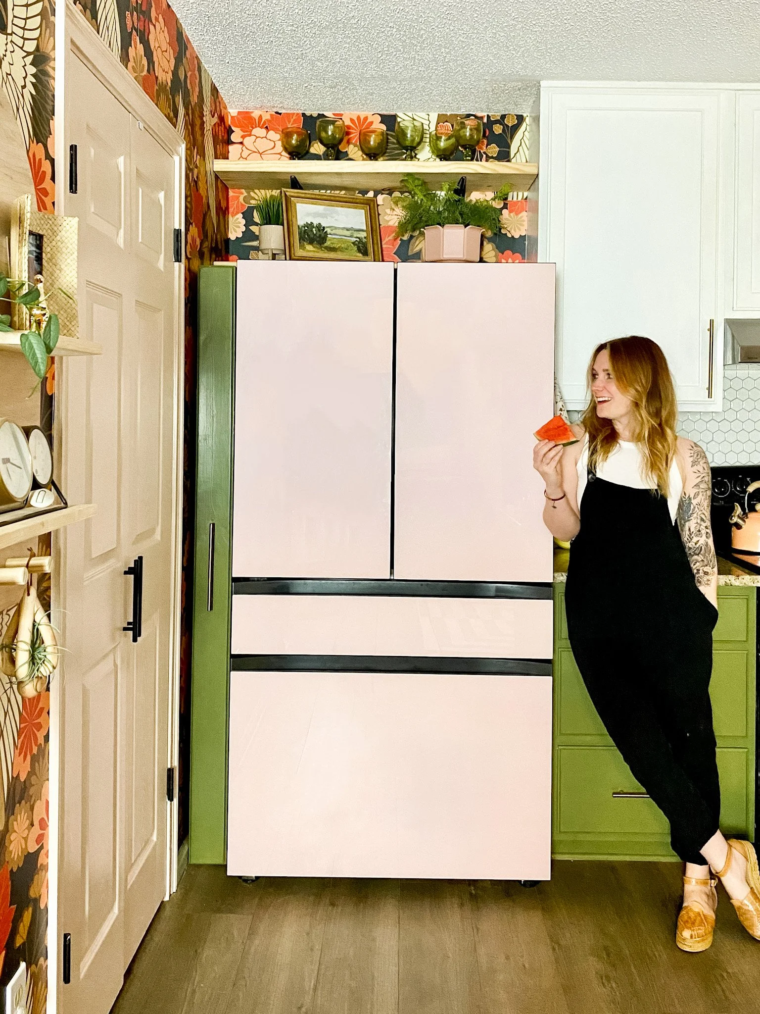 The transformation of this kitchen and dining area in the last four years is nothing short of mind blowing to me. It’s insane what you can do with a little paint and wallpaper. Of course, a new sleek pink fridge doesn’t hurt either.